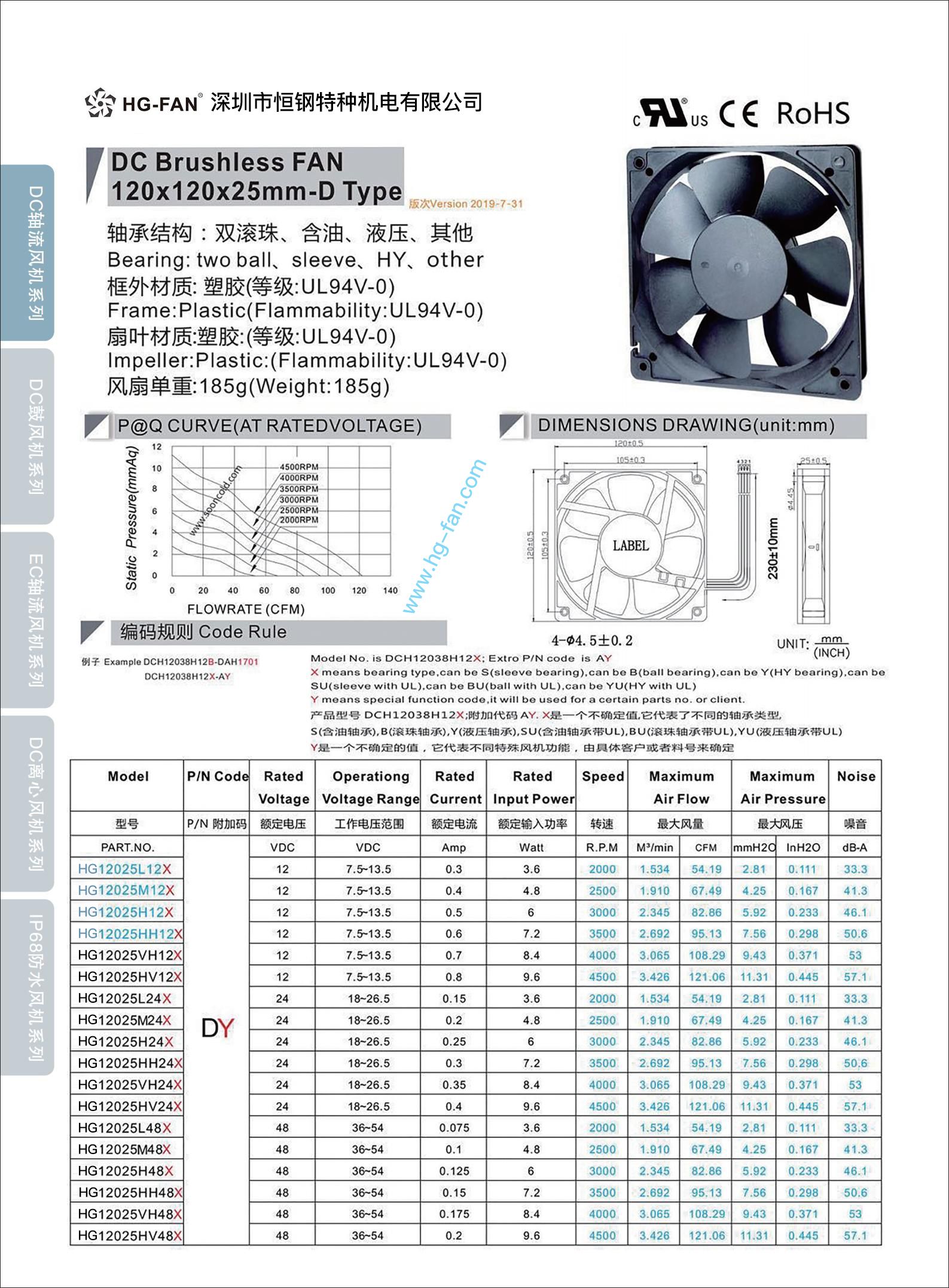 品牌:HG-FAN 型号:HG12025B12 加工定制:是 电机功率:1.56 w 电压:12 V 电流:0.16 A 风量:60.60CFM 适用范围:广泛 风叶直径:120mm mm 转速:2000RPM 特殊12025直流风扇制造如下: