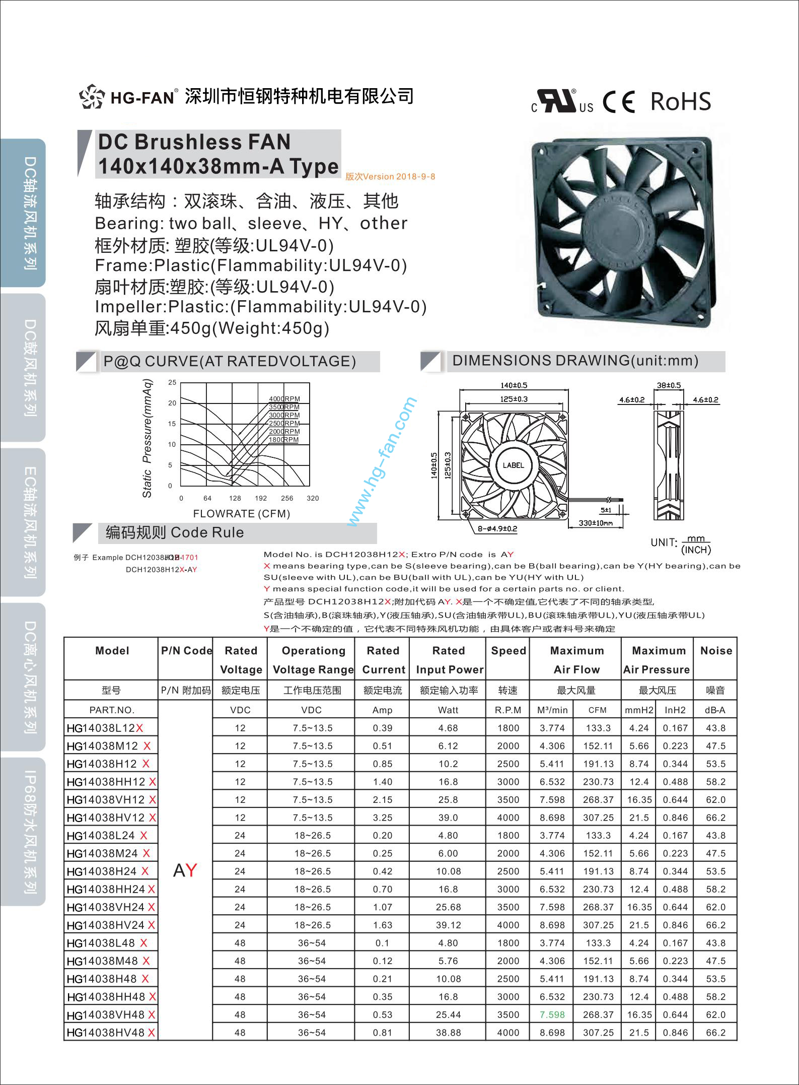 品牌:大风量 型号:14038 加工定制:是 电机功率:80.40 w 电压:24 V 电流:3.35 A 风量:367.62CFM 适用范围:广泛 风叶直径:140 mm 转速:5500RPM 深圳市恒钢特种机电有限公司是国内散热风扇为数不多的自主研发 自主开模的散热风扇生产商自主研发的模具,我司新近研发开模的12038 14038 15050 3010,3510,4010,9733一系列风机只有本公司一家使用,并会有专门的维护,并不断的改进 ,在扇叶的平衡性和降低噪音方面有很大的提高,使用寿命也就更长了。综合性能比一线品牌提升20%-40%可完美替代一些进口品牌如台达,NMB 日电产,建准,永立,ADDA。