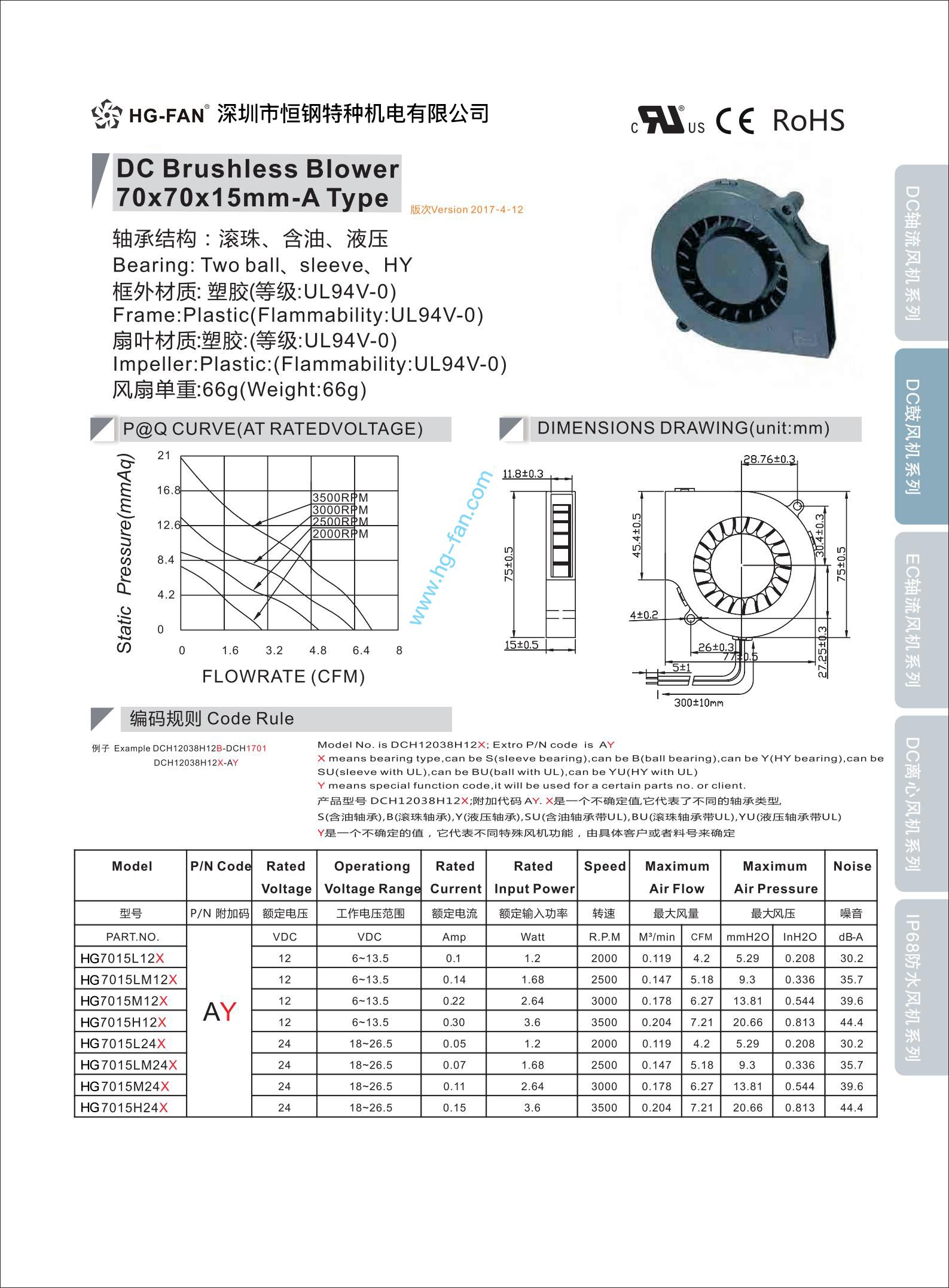 7015鼓风机 7015直流鼓风机目前我司设计开发的静音、低功耗、超大风量、大风压、大功率、大尺寸防水风扇,主要针对于:加湿、讯电源、通讯机箱、工控设备、冰柜、雪柜、变频器、军工产品、潜水设备、船帕部件、逆变电源、工业电源、工业设备等行业和产品设计的,满足客户对于防水散热风扇的需求。