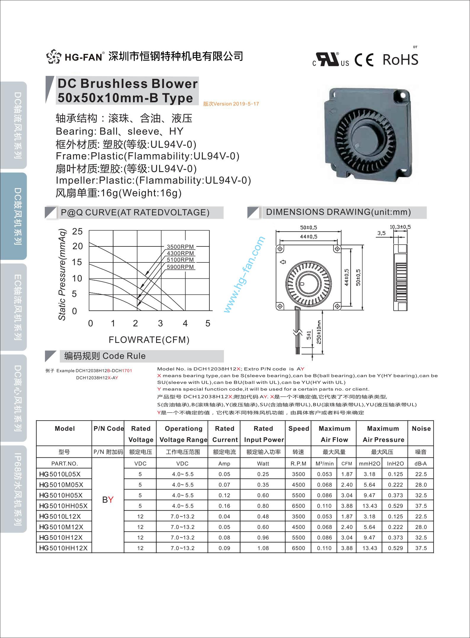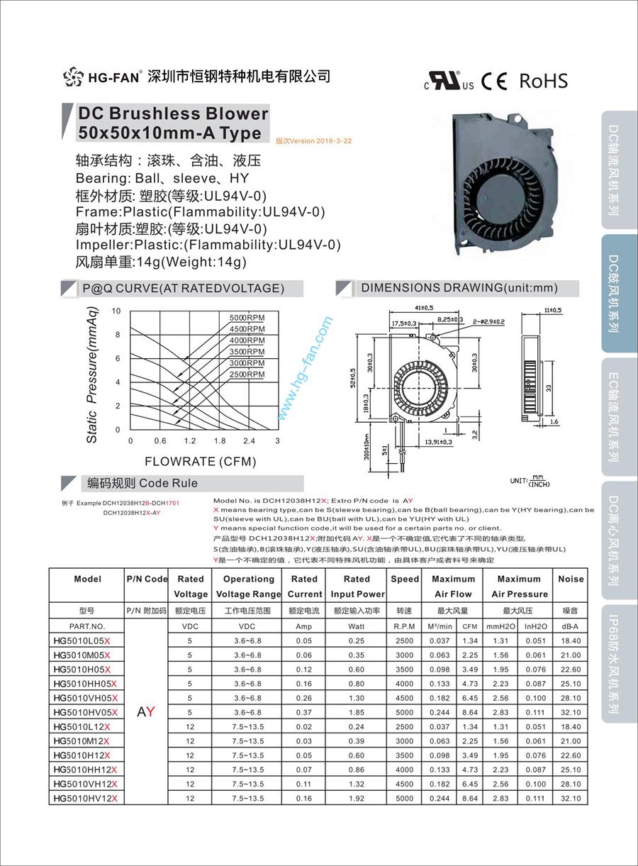 品牌:5010直流鼓风机 型号:5010 加工定制:是 电机功率:3.6 w 电压:12 V 电流:0.30 A 风量:7.21CFM 风叶直径:70mm 转速:3500 r/min