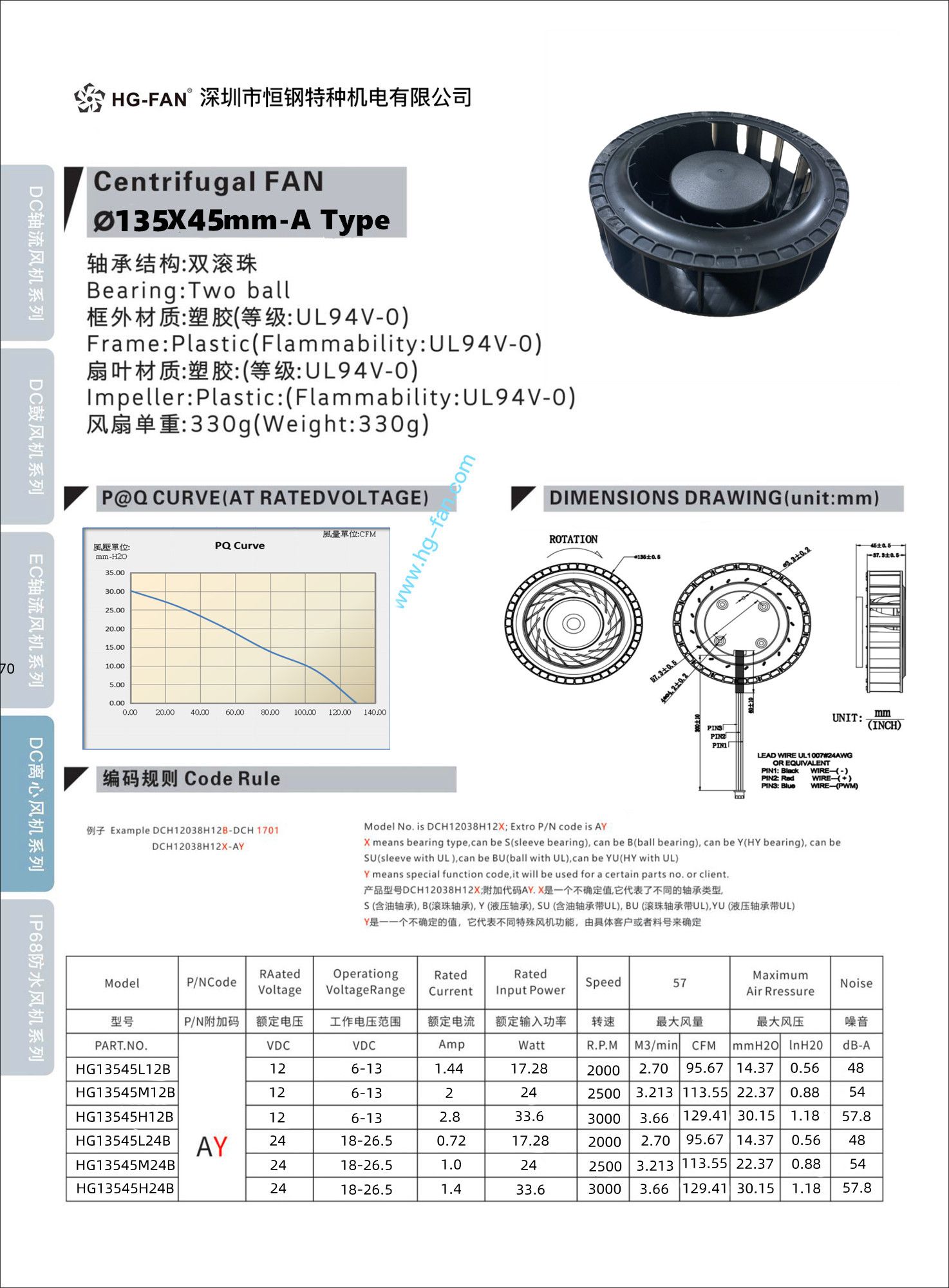 品牌:HG13545 型号:H24B 加工定制:是 电机功率:16 w 电压:24 V 电流:1.4 A 风量:132CFM 适用范围:广泛 风叶直径:135 mm 转速:2800